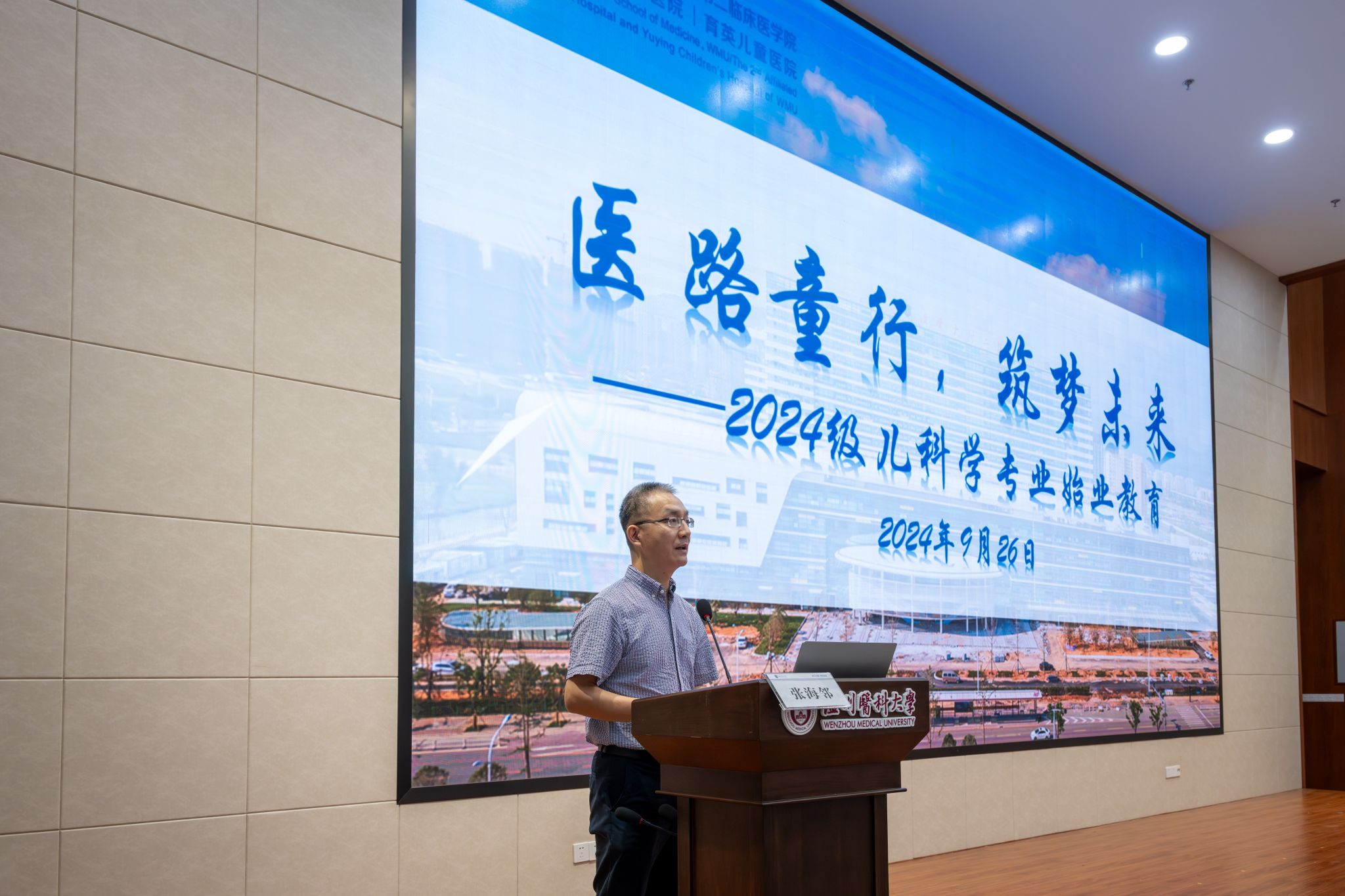为激发儿科学子的学习热情,传承温州医科大学儿科精神,2024年9月26日下午,温州医科大学第二临床医学院/儿科学院在生物科研楼二楼学术报告厅召开“开学第一课”暨2024级儿科学专业始业教育活动。儿科学院院长王天有、武汉儿童医院副院长陆小霞、第二临床医学院执行院长张维溪、第二临床医学院儿内教研室副主任朱将虎、2024级辅导员及新生班主任出席本次活动。活动由儿内教研室主任张海邻主持。