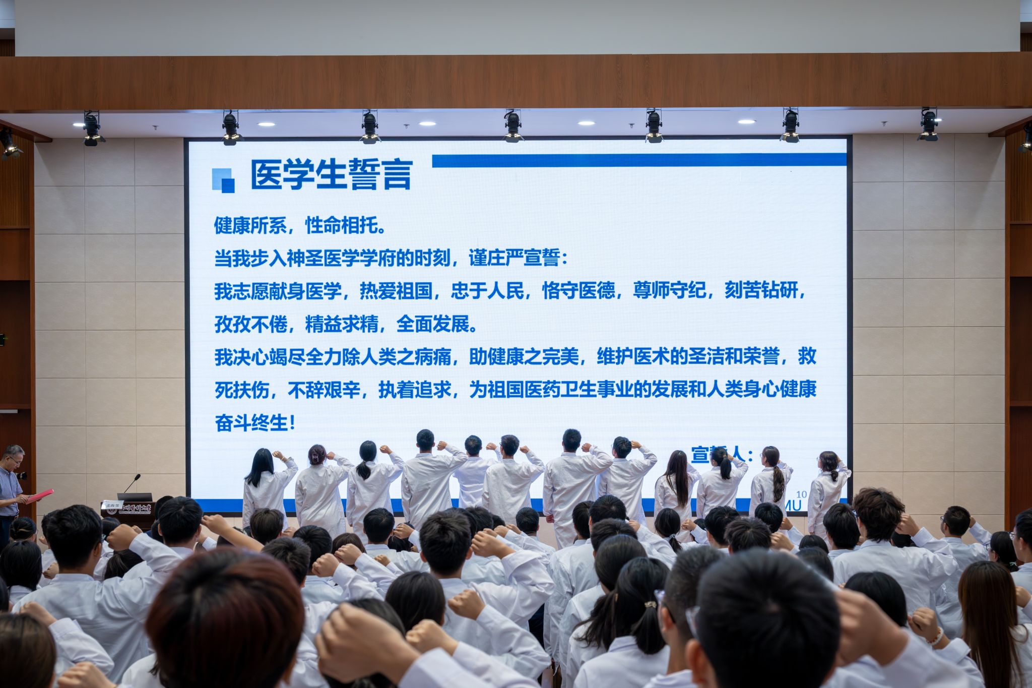 新生授袍仪式上,陆小霞、张维溪等老师亲手为新生代表穿上白大褂,并扣好第一粒扣子。“健康所系,性命相托。”最后,身披白袍的新生们齐声宣誓,坚定地表示他们将秉持医者仁心,为守护人类身心健康而奋斗终生。